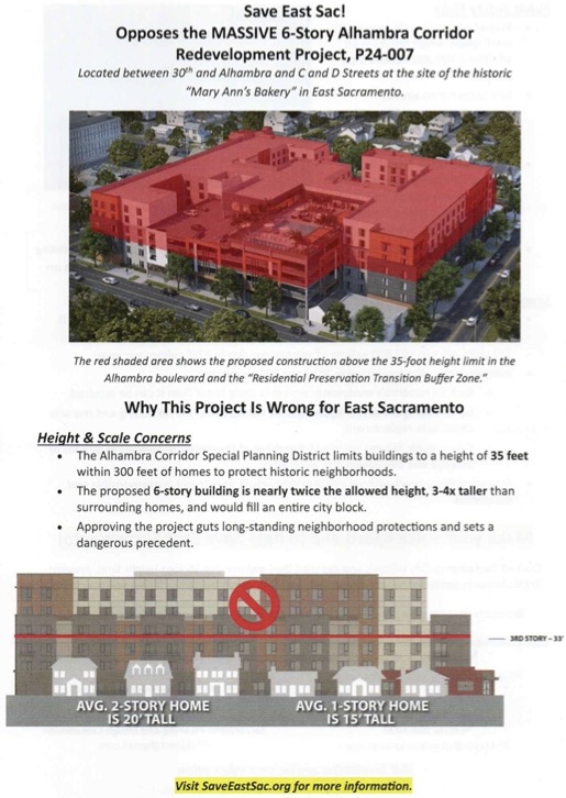 East Sacramento Preservation, Inc. (ESP) is a Sacramento Neighborhood Association that is writing in opposition of the proposed development of Project number P24-007 (Alhambra Redevelopment Project), at Alhambra and C and D Streets.