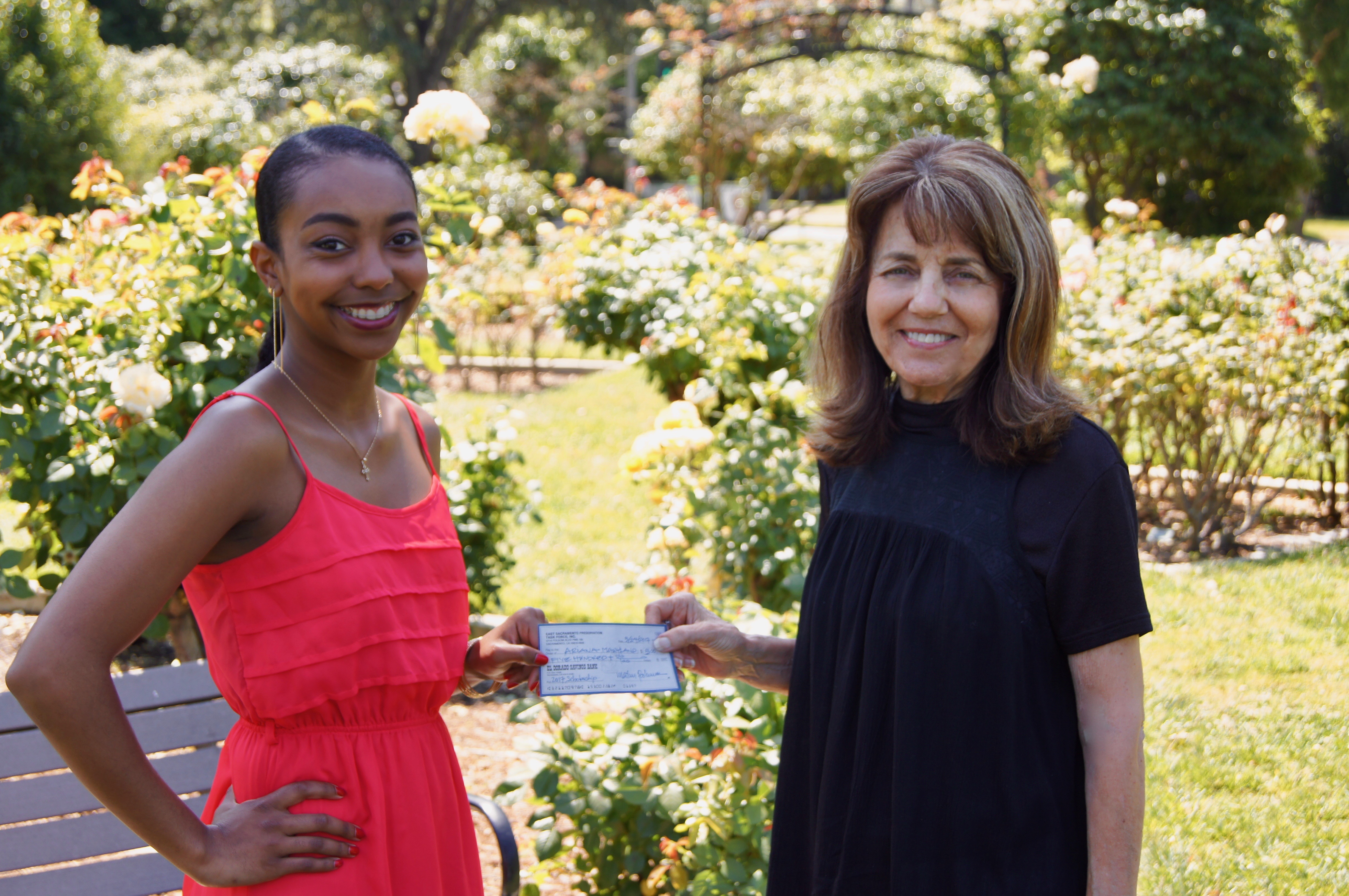 2017 East Sacramento Preservation Scholarship winner receives the award from ESP president Janet Maira