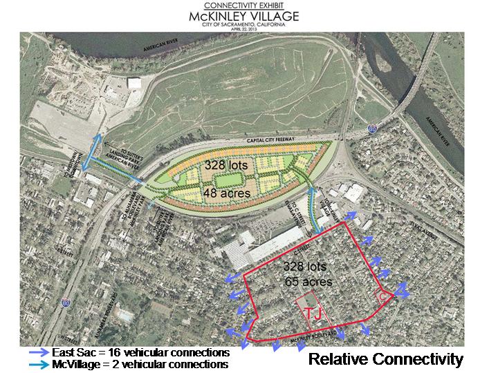 Walkability is a conscious choice. I can’t think of a more walkable/bikeable location for this meeting than this building yet I’ll bet many of us drove here. Will McVillage residents be any likely to walk more? To put that in context, it is about ¾ of a mile from the center of McVillage to both Theo Judah and Compton’s. Even if residents can use the Alhambra pedestrian tunnel (which won’t be built until the project’s 3rd phase,) it is about ¾ miles to this building and 0.9 miles to both Sutter Middle School and Safeway. Very few people carry groceries a mile on foot and based on my experience living near Judah, just about all parents will be driving their kids to school. Vehicular connectivity to the existing community is at only two locations placing significant impacts on neighbors, especially near those points of connection. They claim that McVillage is “designed to fit into Sacramento’s urban fabric” yet this project only provides 2.5 points of connectivity. Compare that to existing neighborhood connectivity as shown on this slide with 16 points of connection. Does it really fit into our urban fabric?