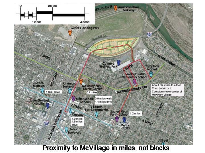 The ability of the development to provide transportation choices other than vehicles will be dependent on the new residents ignoring what is sitting in their 2-and 3-car garages and embracing a transit, pedestrian and bicycle lifestyle. Generally urban planners assume that people are willing to walk about ¼ mile to good public transit, otherwise they will not use it. The nearest bus line (#34) that runs down McKinley Blvd. is 0.7 miles away from the center of McVillage. This bus only runs once per hour and it may be going away once Sutter Memorial Hospital closes, in which case bus lines on J Street are a full mile from the McVillage center. The developer has indicated no interest in providing a dedicated shuttle for residents to connect them to public transportation and neighborhood services.