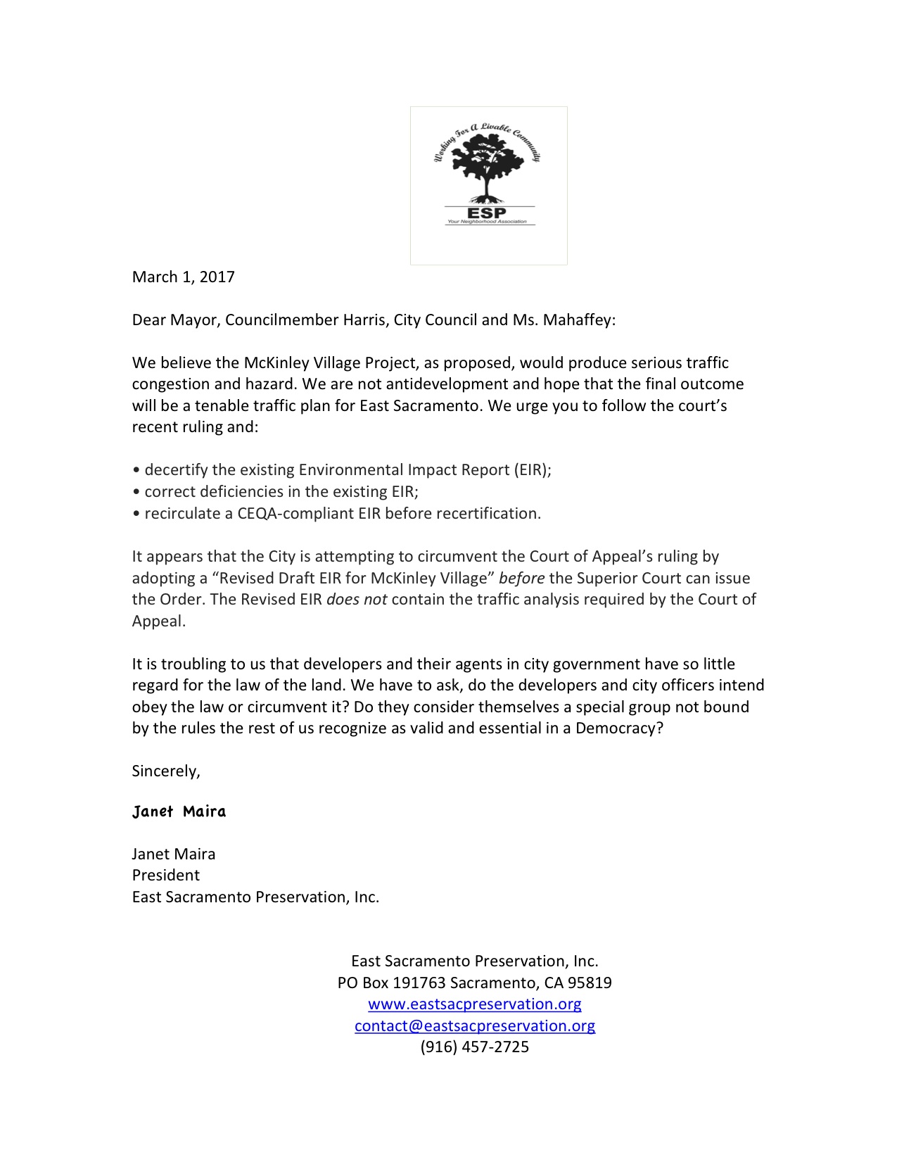 - Urge the City to comply with the decision of the Court of Appeal in the case of East Sacramento Partnerships for a Livable City (ESPLC) v. City of Sacramento, et al. by decertifying the current EIR, conducting a full, independent traffic analysis, and recirculating the EIR for additional public comment.