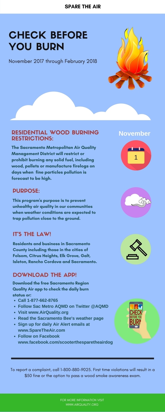 This law applies to residents and businesses in Sacramento County and the cities of Folsom, Citrus Heights, Elk Grove, Galt, Isleton, Rancho Cordova, and Sacramento through February. You must Check Before You Burn to find out if burning is allowed in your indoor or outdoor fireplace, wood stove, fire pit or chimney.