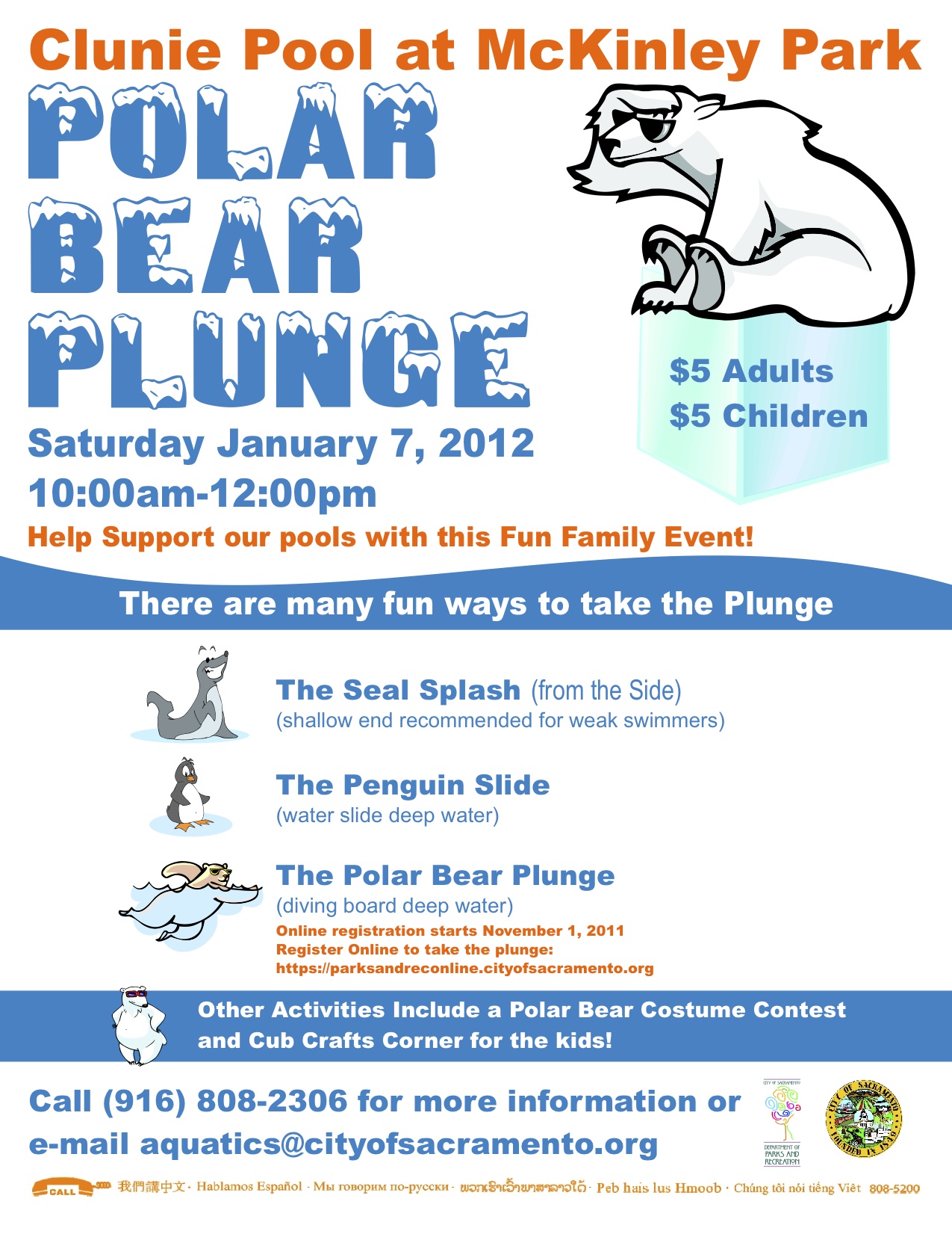 The City of Sacramento, Parks and Recreation is holding its 1st Annual Polar Bear Plunge on January 07, 2012, as a fundraiser and community awareness event about the loss of funds to support our pools. They would like to request your support in any way possible.  This could include help marketing our event to ensure we get a large number of participants and sponsors, directing anyone who can help sponsor this event or the City of Sacramento Pools our way, and help with any ideas that would make this event a success.  If you can help us in any way please contact us.